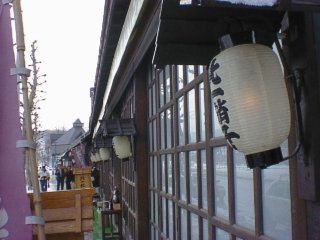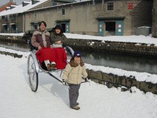 小樽運河では親孝行な息子の人力車です。雪の小樽もいいねぇ。 |