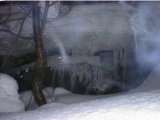 千歳に無事到着し、バスで定山渓温泉につきました。すごい雪と氷です。着いたらもう暗くなっていましたが、とりあえず温泉街を散歩しました。ぼやっと写っているのは心霊写真ではなく、温泉の湯気です。 |