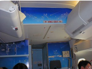 ボディは全面ディズニーの絵でも乗ったら見えないから普通といっしょだと思ってましたが、違いました。窓や天井に星やらがちりばめられた内装でした。写真は最後尾の壁です。飛行機の絵葉書とかもいただきました。 |