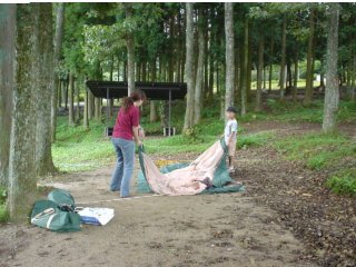 ![]() | 朝6時に家を出ると10時前には駒ヶ根家族旅行村へ着きます。予約もなしだったけどOK!テントを張ります。真夏のキャンプなら大汗をかく作業ですが、もうすっかり涼しい信州では楽勝です。 |
