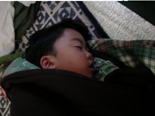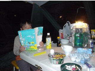 ![]() | あーよく遊んだ。すっかり夜に。宿題はテントでやります。おー!なんかスゲー勉強好きそうやでぇ。 |