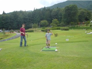 ![]() | 昼からはのんびりパターゴルフをすることに。ちょうど家では「マリオゴルフ」というTVゲームで盛り上がっているのでここでも力が入ります。とってもショートコースではありますが、山あり谷あり川あり。芝もきれいに整備されています。18番まで2時間ぐらいかな!?ゴルフも気候がいいとやる気になります。集中力も継続できるし。 |