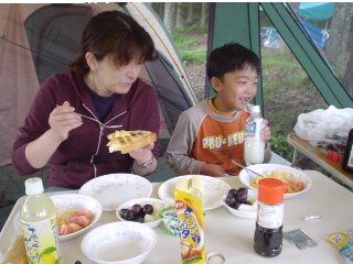 ![]() | おはー!山の朝はいつだって気持ち良い!この瞬間が一番好きです。ゆっくり朝食を作ります。りゅうちゃん特製のプレンオムレツです。 |