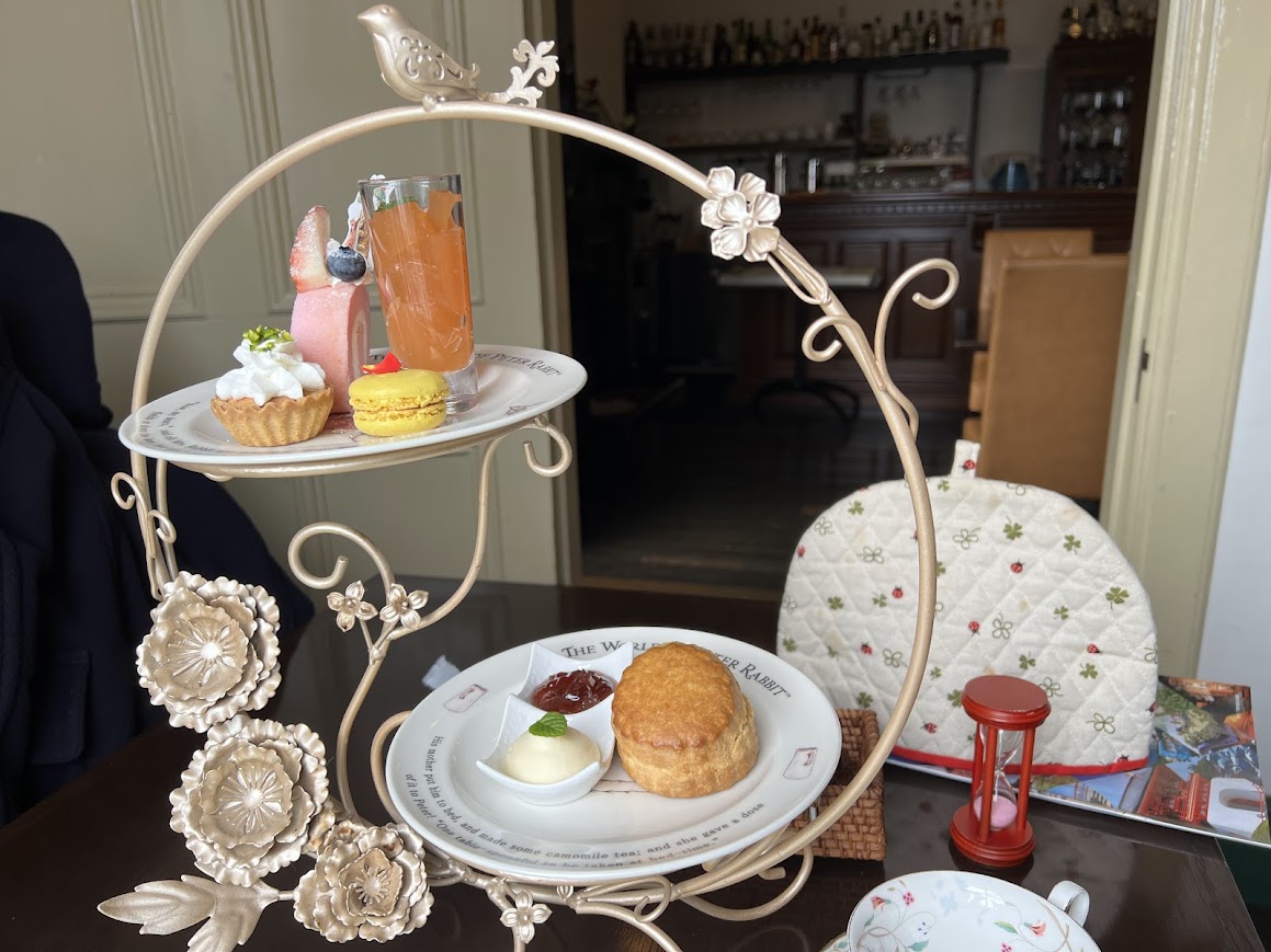 2階にはティールームがあります。ここでアフタヌーンティをいただきました。 食器はウエッジウッドのピーターラビット。 |