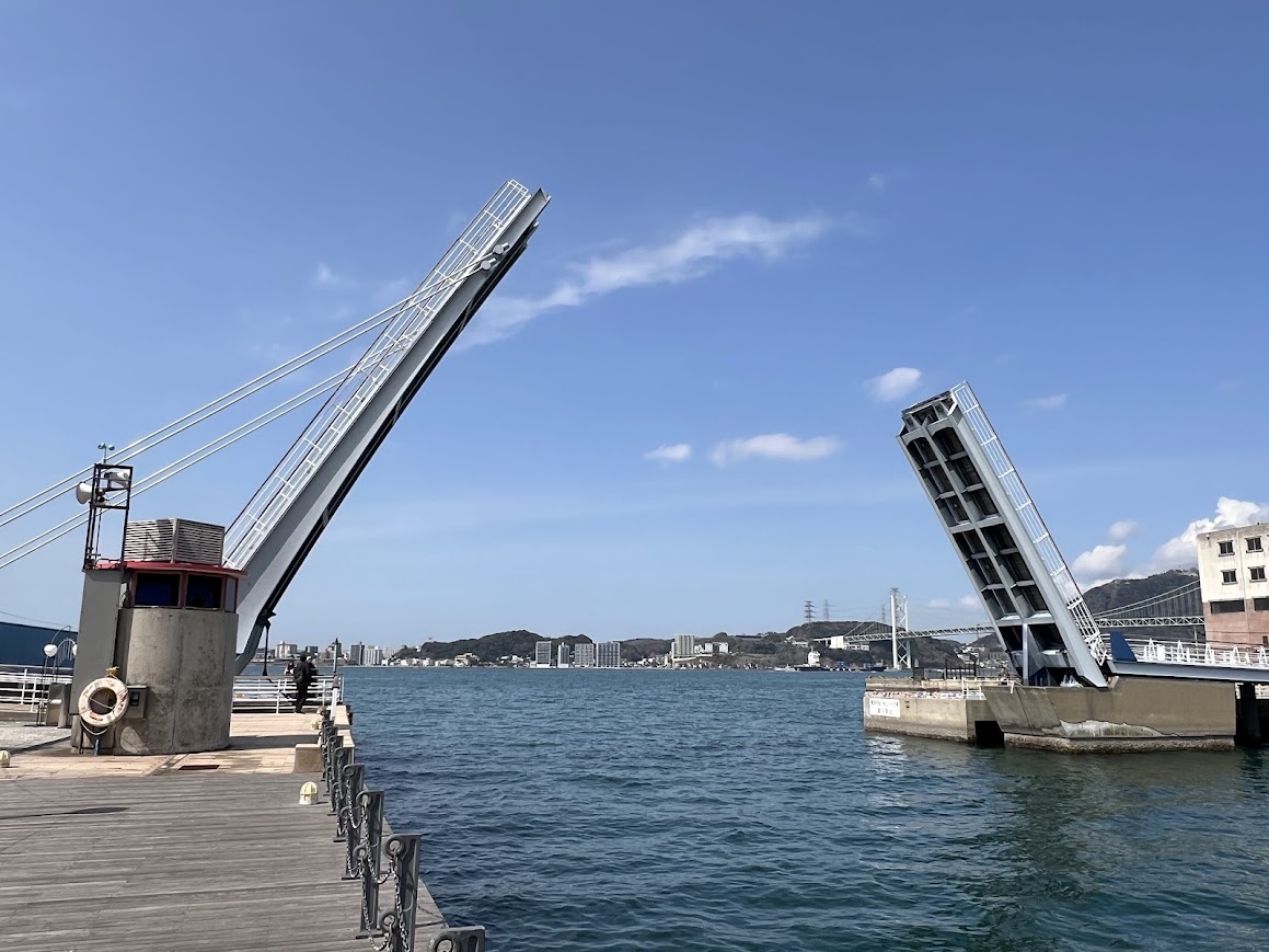 日本最大級の歩行者専用のはね橋。恋人たちの架け橋ということから恋人の聖地なのだそうです。 |