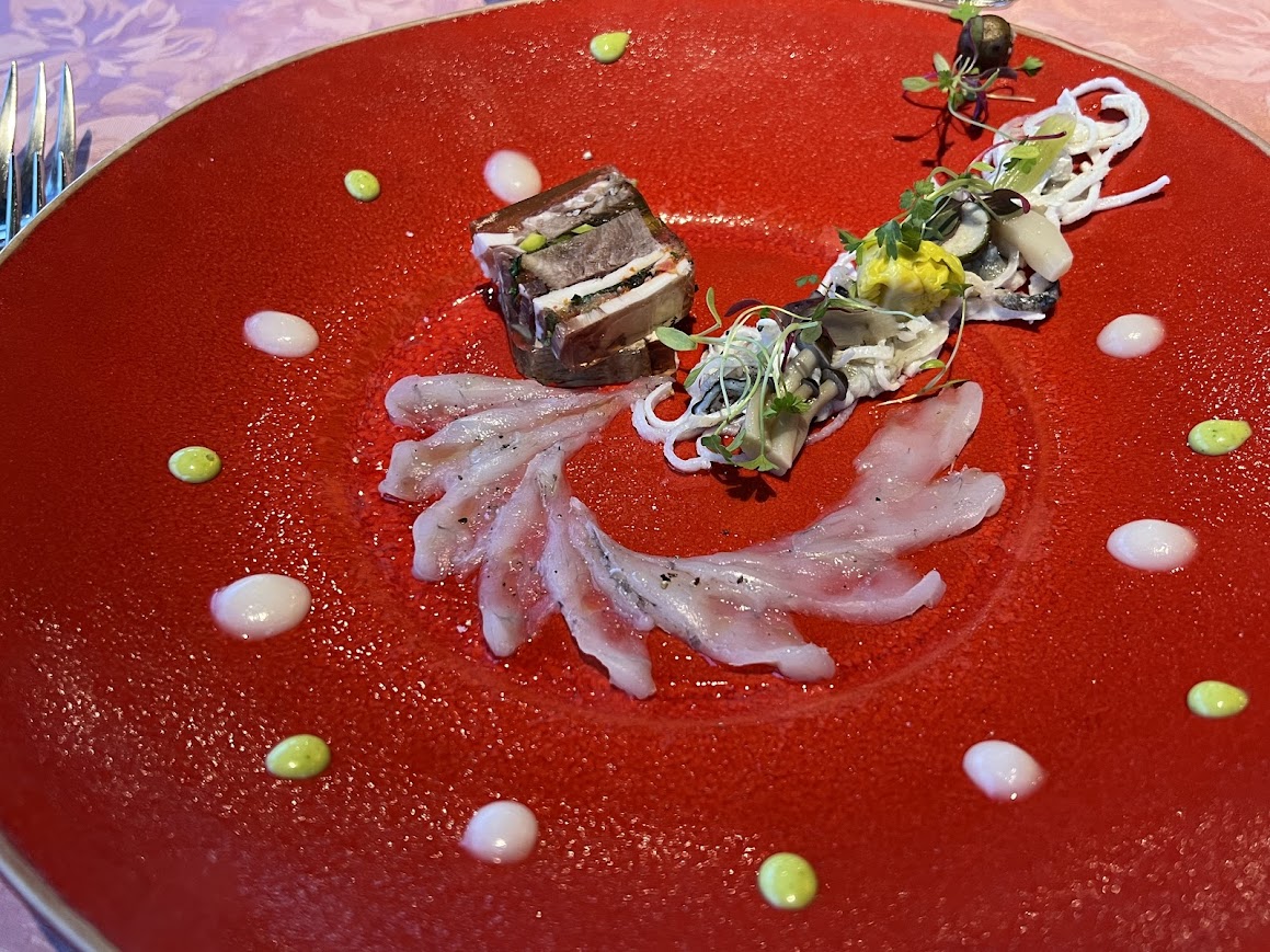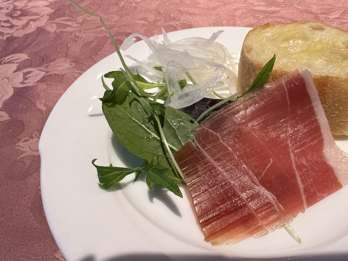 目の前で切ってくれる生ハムとパン。こちらはアラカルトメニュー。 |