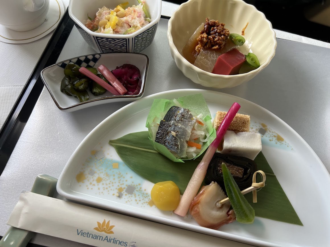 ベトナム航空の和食。このあとメインとご飯、お味噌汁が出て完食。おいしくいただきました。 |