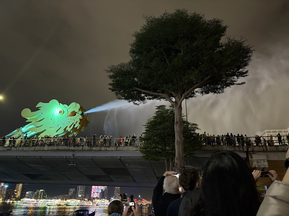 シンガポールのマーライオンみたいな像。滝を登る鯉をモチーフにしているらしい。左にあるビルにはプロジェクションマッピングが!新年を迎えるお祝いが映し出されていました。 |