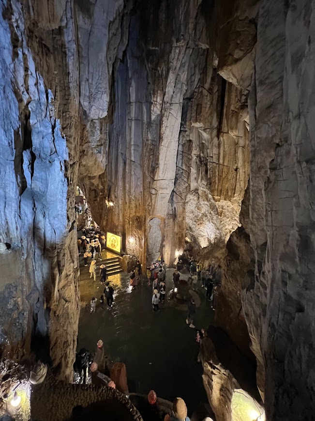 五行山の中で一番天井が高い洞窟。洞窟の上は穴が開いて外から光が入ります。ベトナム戦争のときに空爆で開いたそう。 |