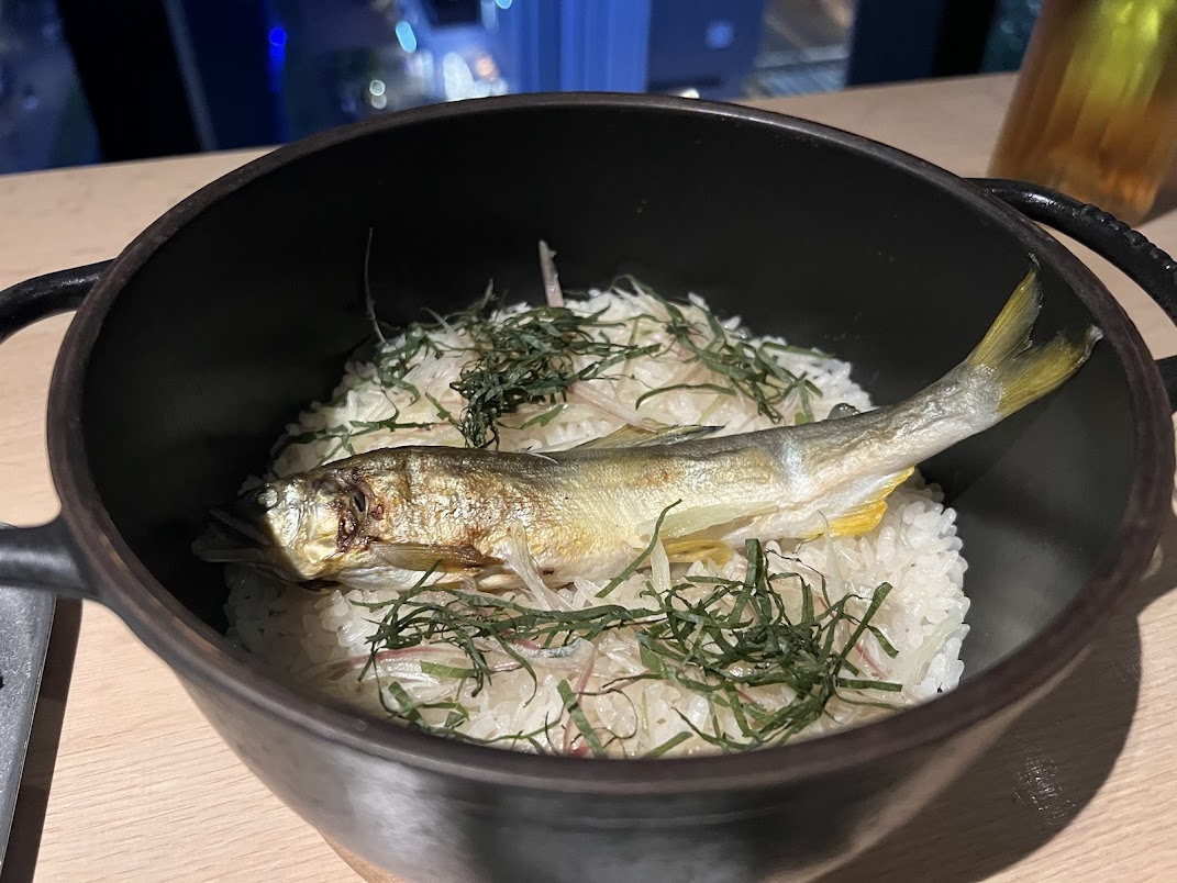ここの〆はバーミキュラで炊いたご飯。今日は鮎ご飯でした。 |