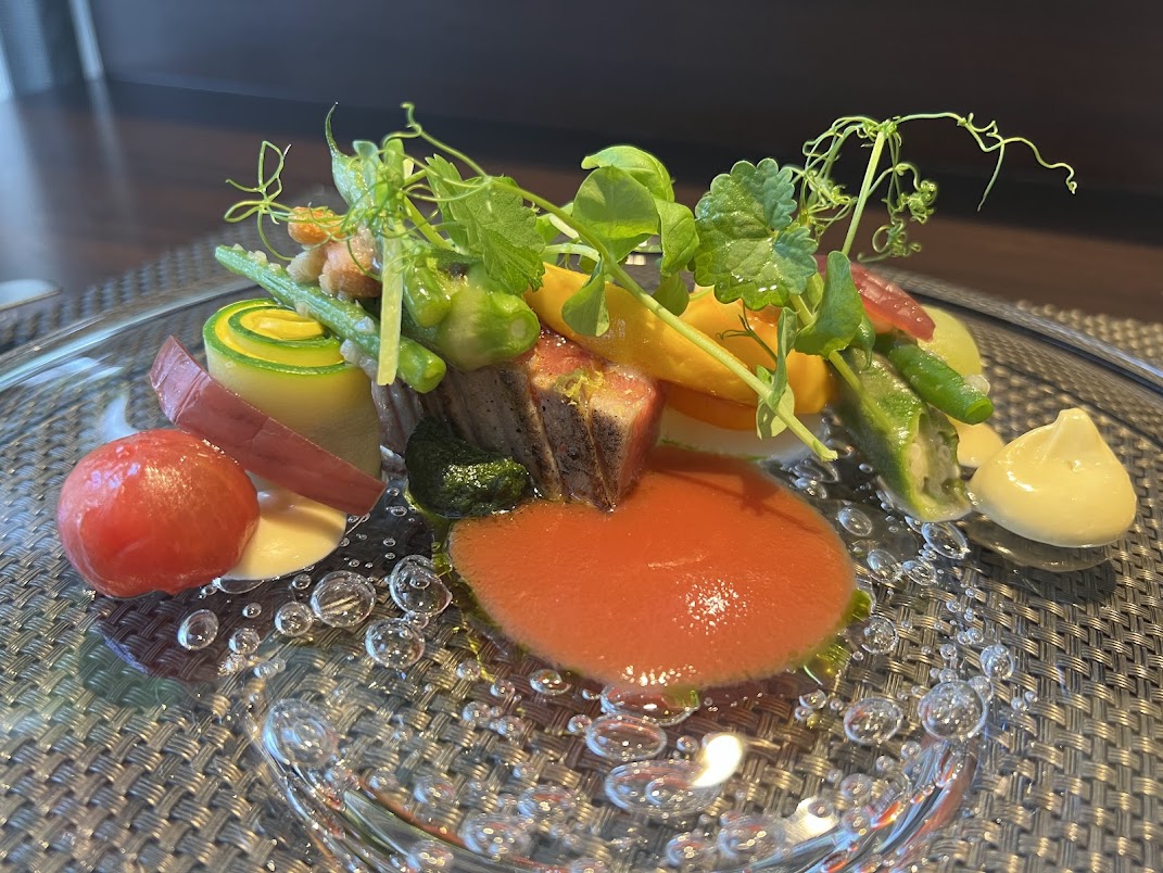前菜の夏野菜サラダ。中にでっかいマグロが隠れています。 |