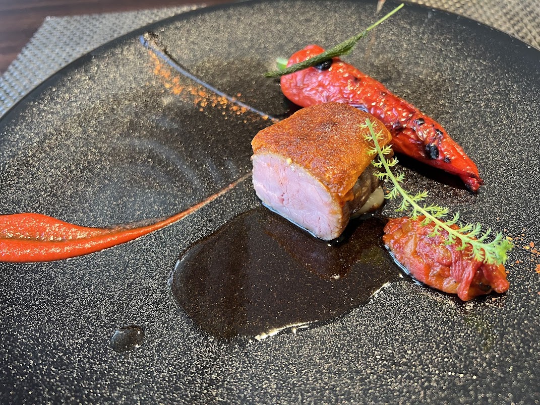 お魚料理に続いてお肉料理。今日は豚肉です。チーズをのせて焼いてあります。そのチーズがなんでこんなにきれいにのっかってるのーって言う感じ。 |