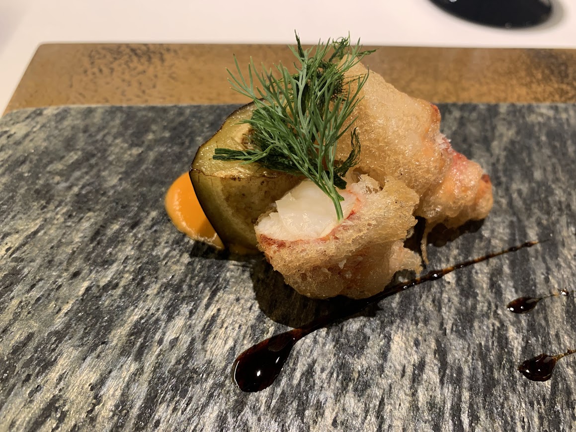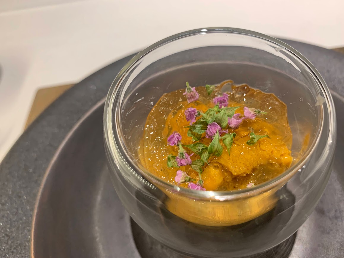 北海道産ウニがたっぷり。愛知のポロネギと一緒に冷たいアミューズ。 |