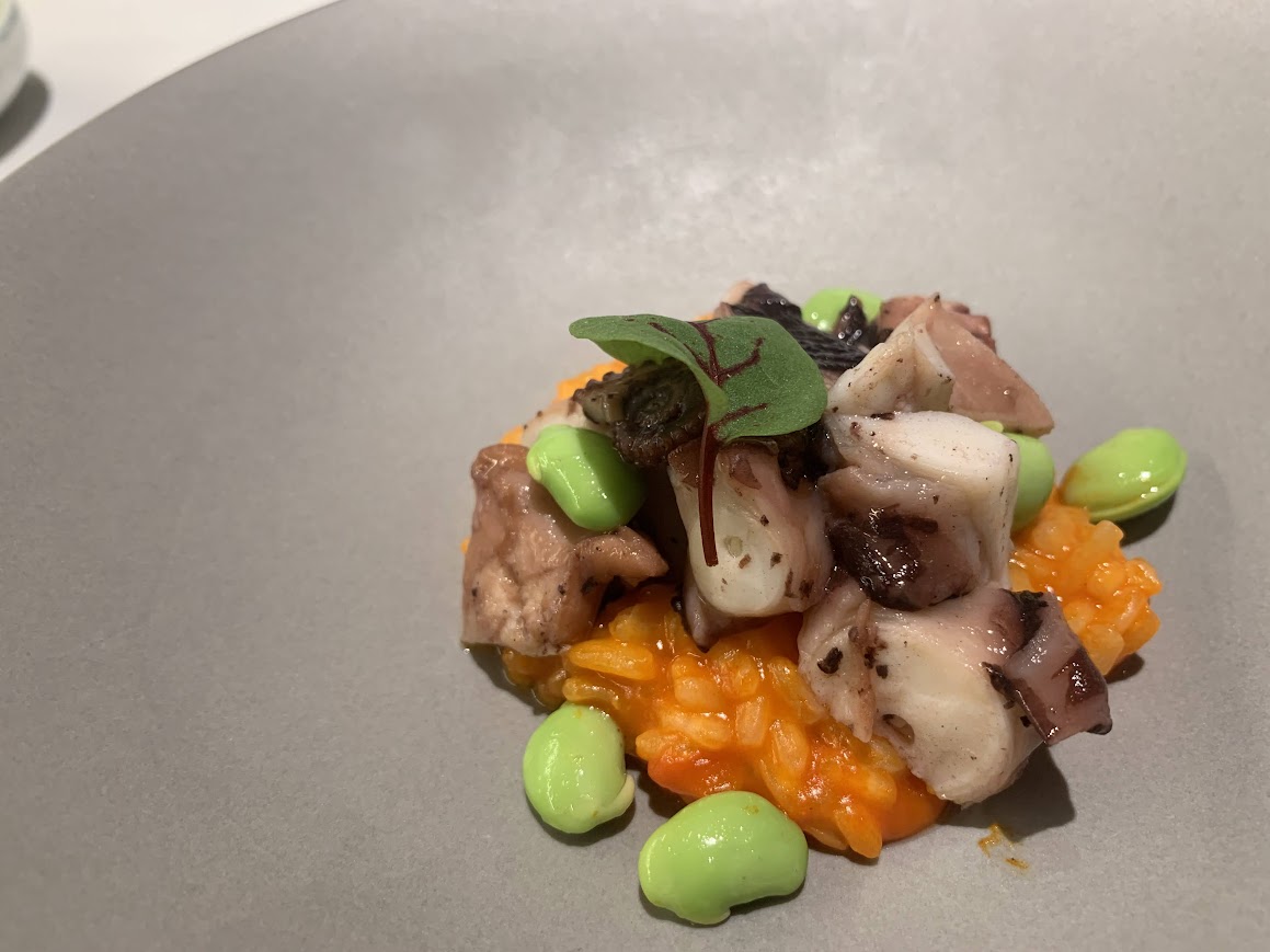日間賀島のタコと京都・赤満願寺とうがらしのリゾット。毎年日間賀島でタコを食べているけれど、別物の顔してでてきたー。 |