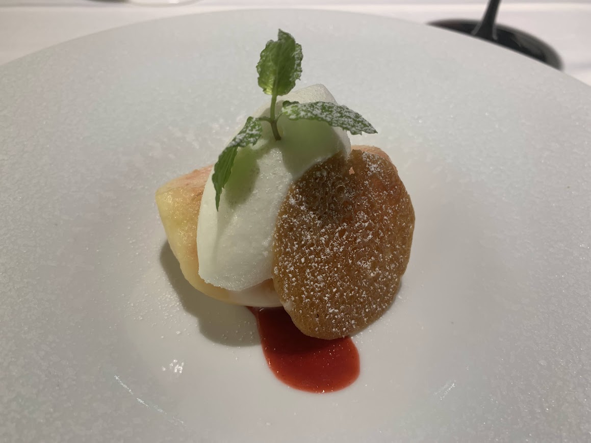 宮城県産の鴨肉がメインでした。デザートは旬の桃。 |