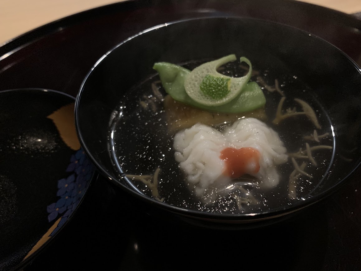 この季節になったら鱧はぜったいだね。 お椀の柄もあじさいで季節感を演出。 |
