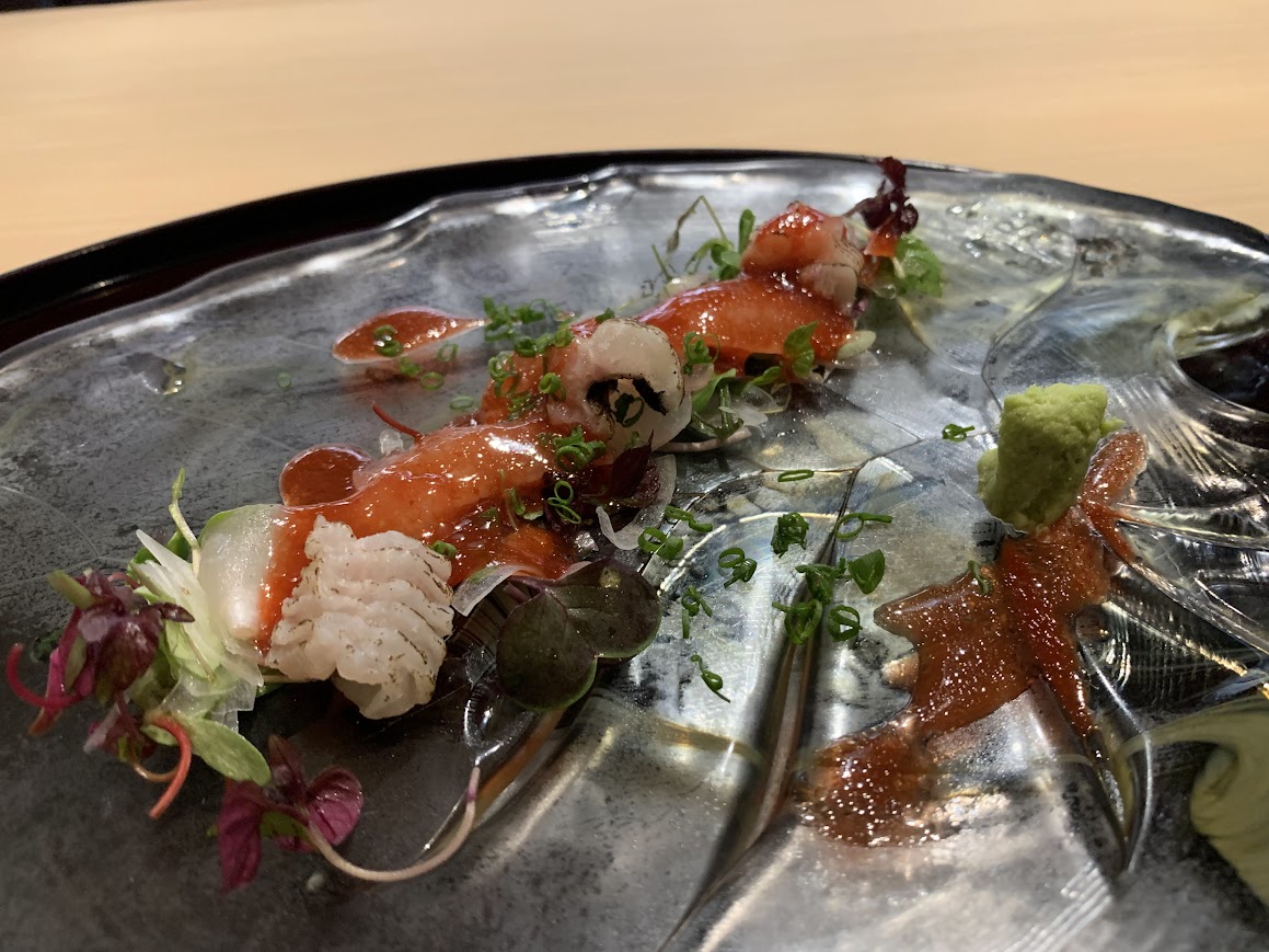 お造りはサラダ仕立て。ジュレにしたドレッシングがおいしいです。 |