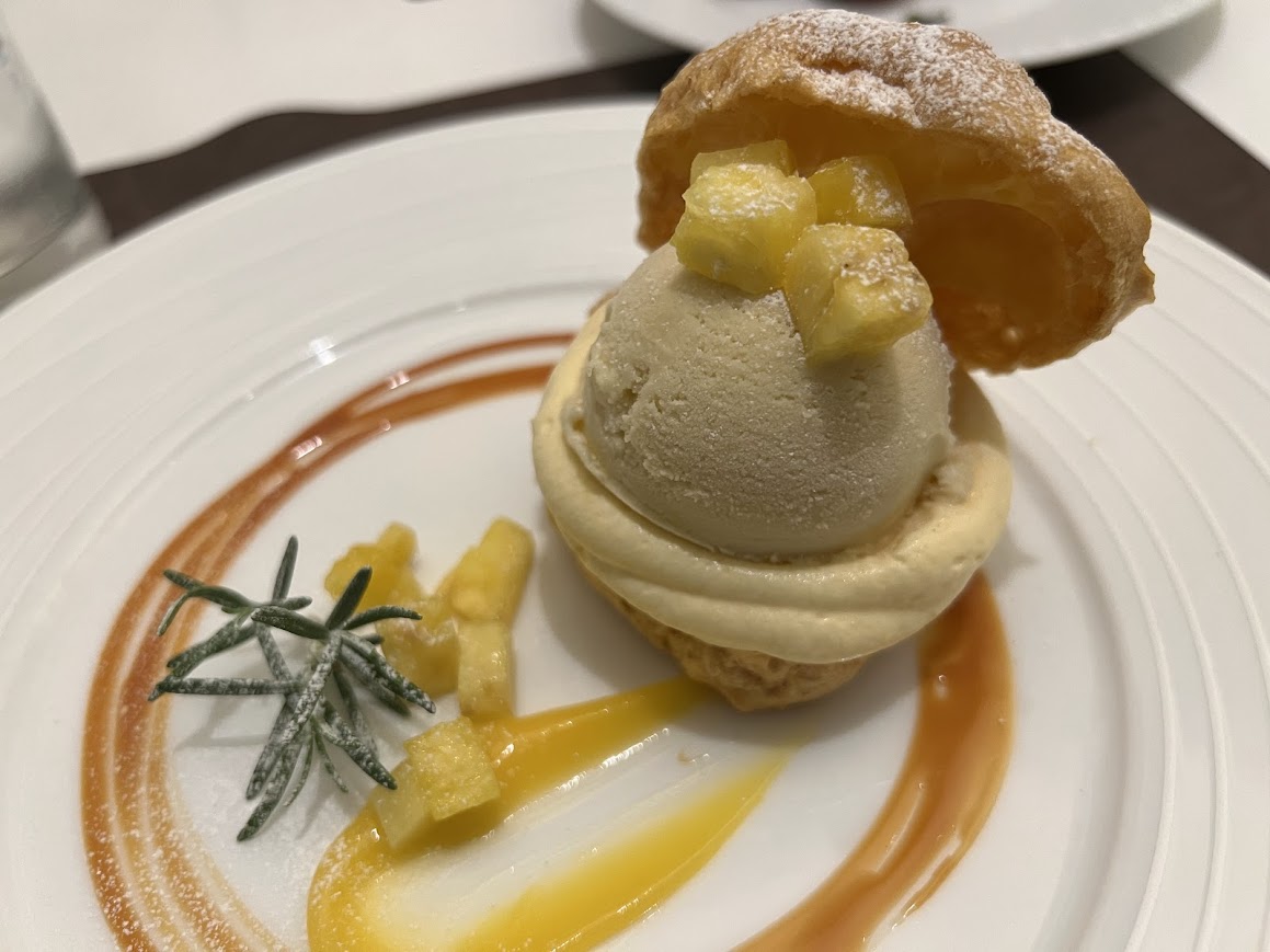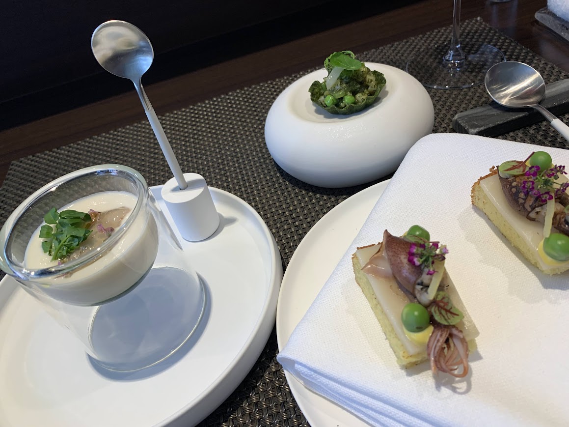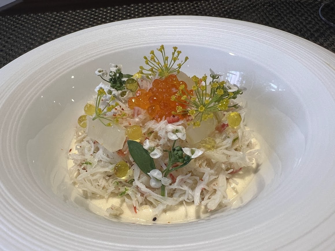 ズワイガニのエフェロッシェとフェンネルのクレーム。甲殻類のジュレと甘エビのタルタル、知多半島のマイクロハーブを添えて。 タケウチお得意の美しい一皿。もちろんお味も大満足。大好きな一皿です。 |