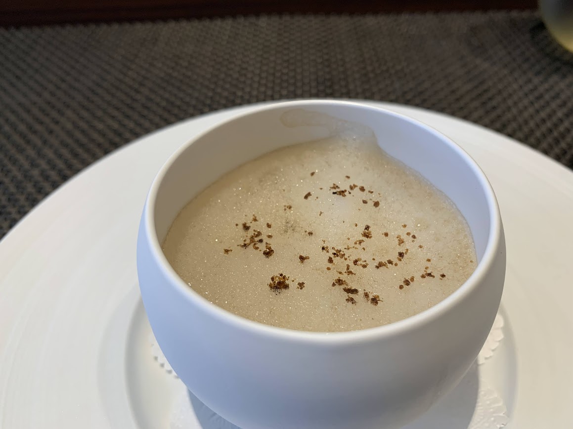こちらもいつもおいしい、フォアグラのロワイヤル。あわあわになっているのはジロール茸。 |