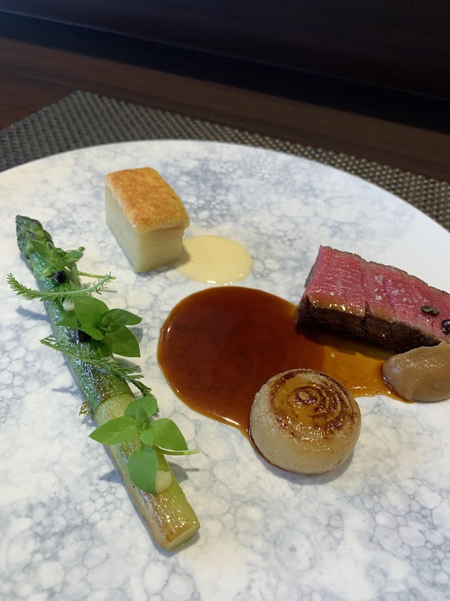 北海道産牛、フィレ肉の炭火焼き。 季節のアスパラもローストで。 |