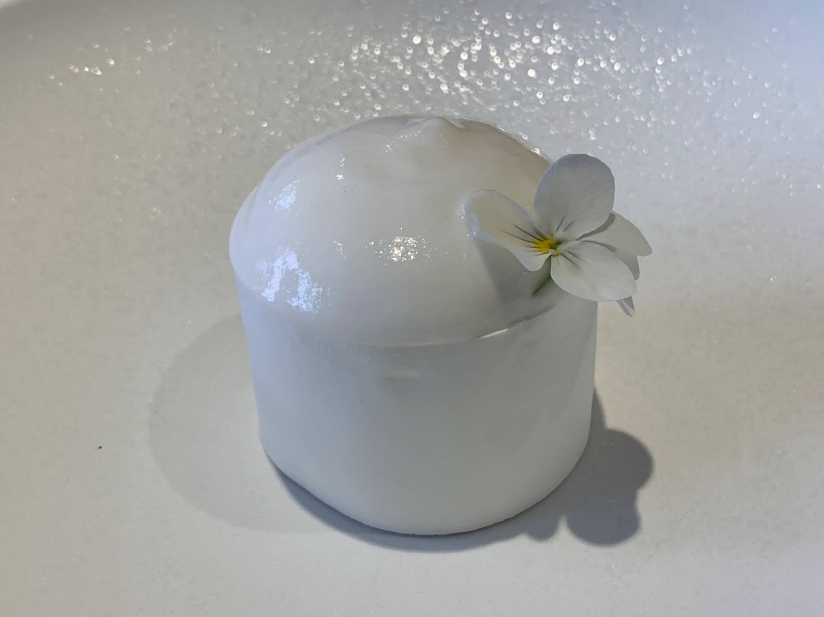 こちらもタケウチならではの真っ白なケーキ。とても繊細で、パリンと割れます。中からは真っ赤なベリーが出てきて目にも鮮やか。白さがきわだちます。 |