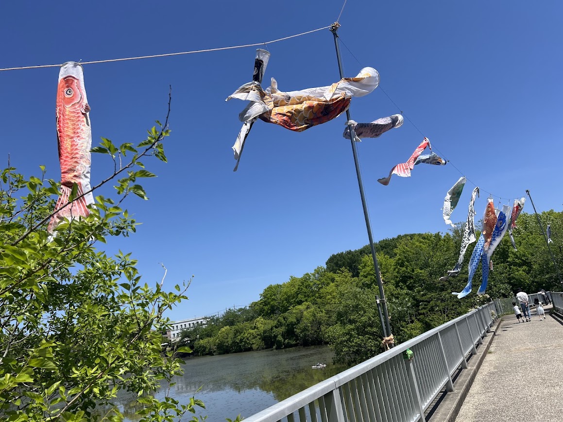 2024.05.05.こどもの日です! 杁ヶ池公園の池にかけられた鯉のぼり。