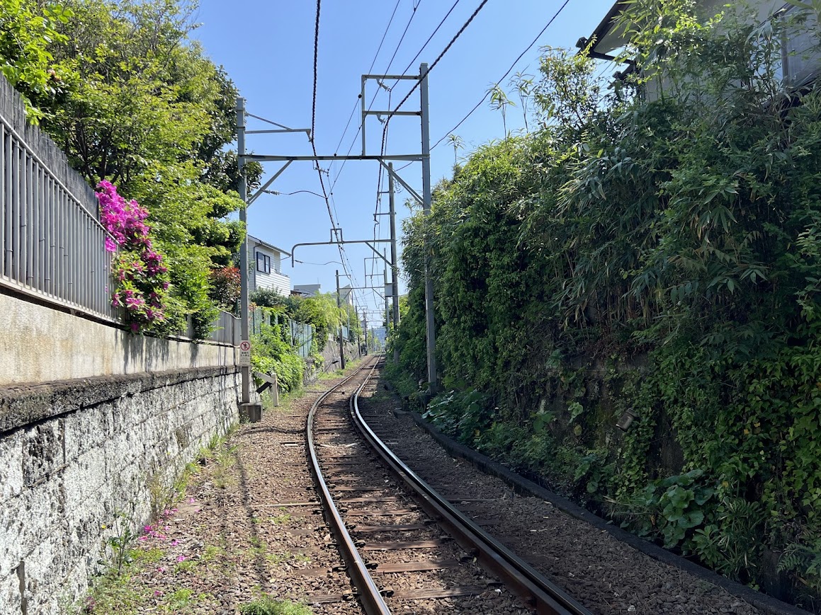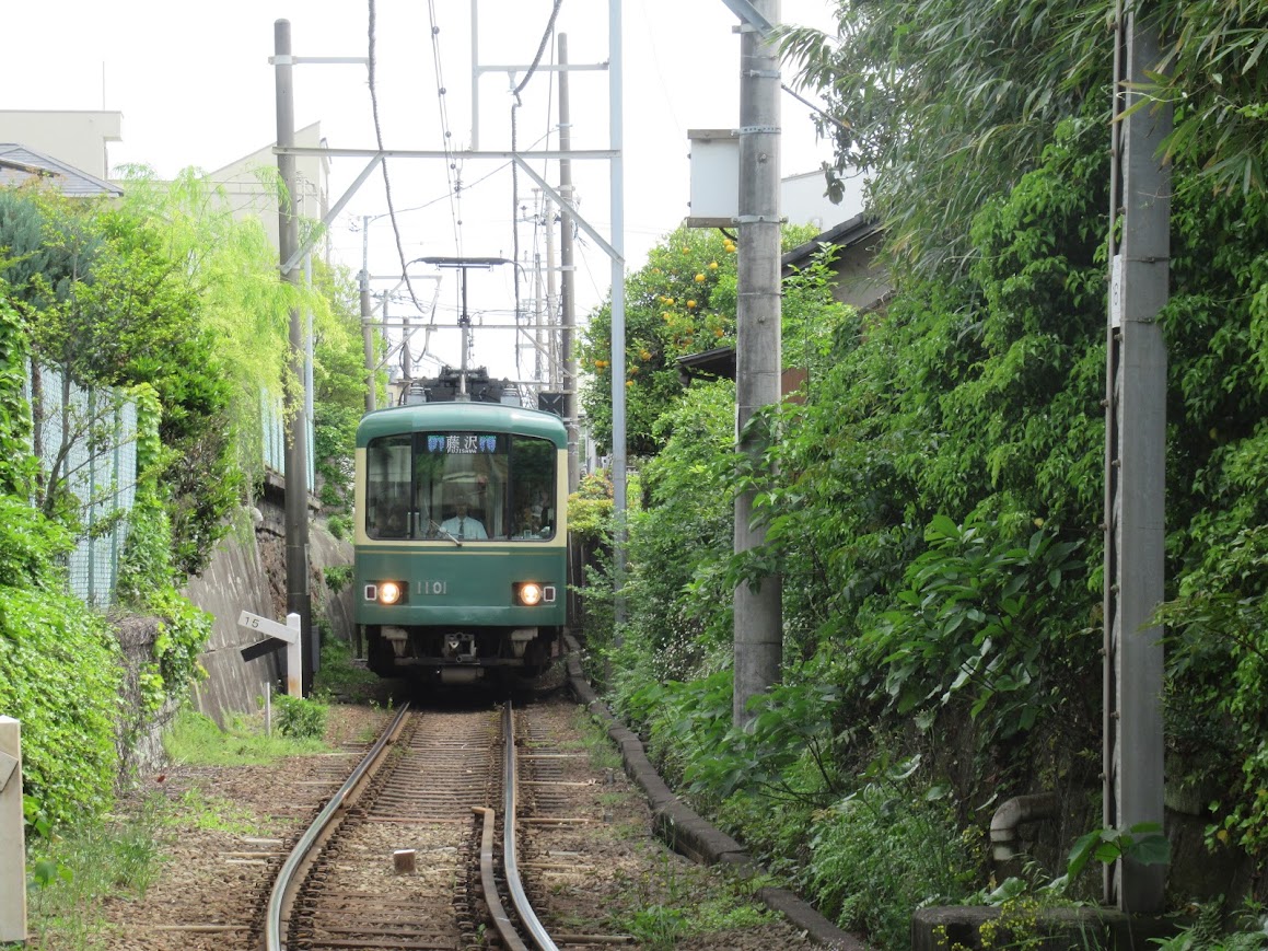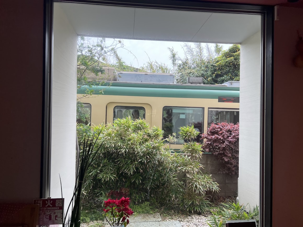 江ノ電線路のすぐ横で乗っている人の顔もしっかり見えちゃう距離です。 |