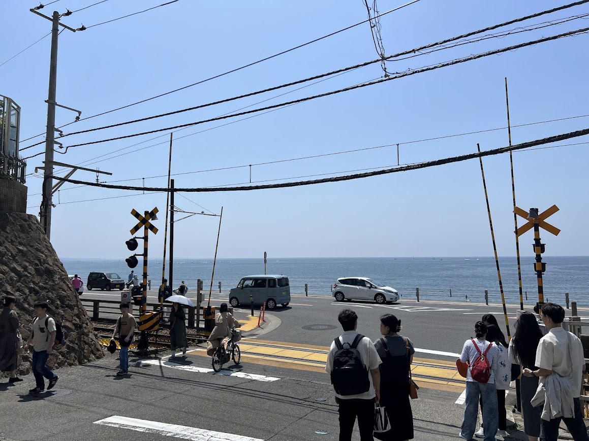 朝ご飯のあとのお散歩で海岸へ。途中、江ノ電の線路を渡ります。この圧迫感が江ノ電だね。 |