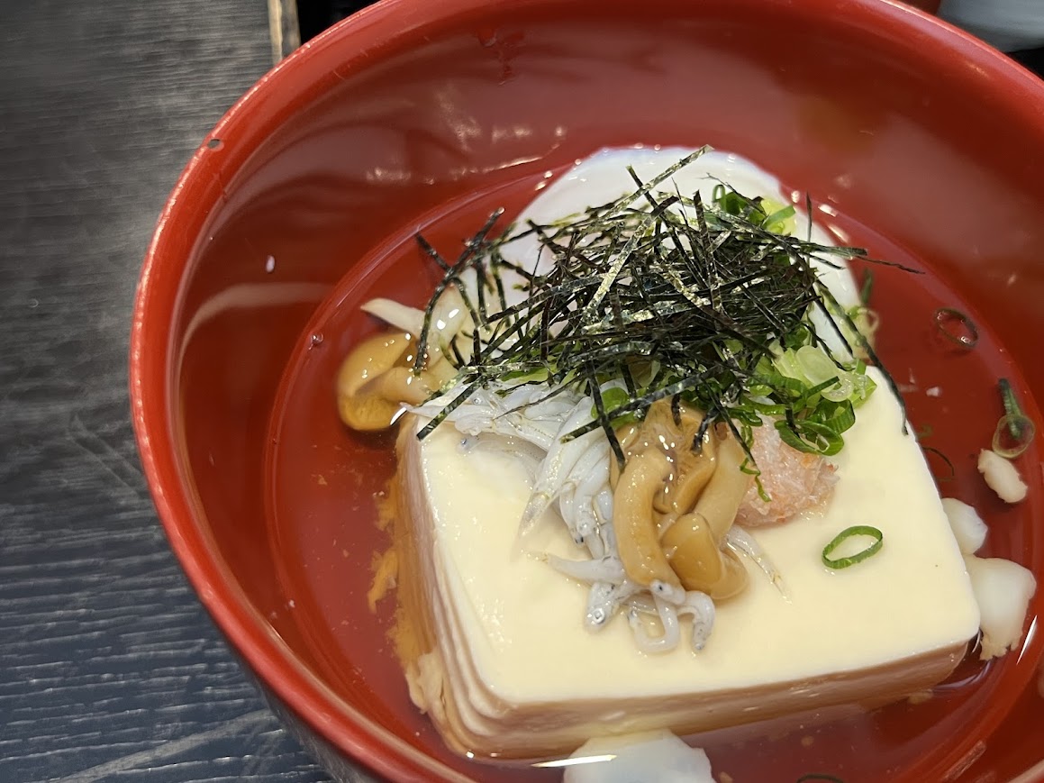 名物の「つきやま豆腐」。 温泉卵をくずして絡めて食べます。つめたいお料理。とてもおいしいです。 |