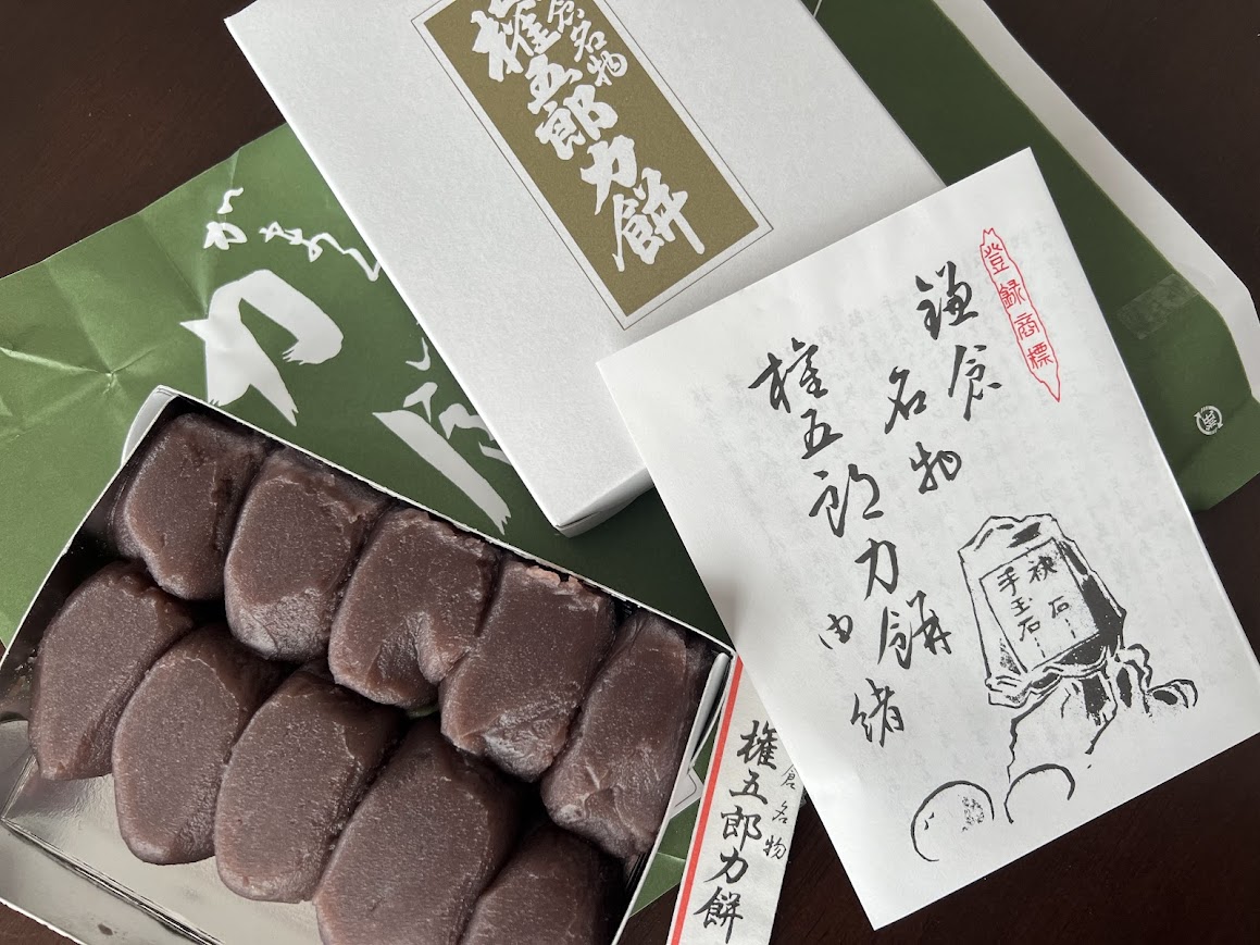 「力餅家」の名物「権五郎力餅」。 景政は源頼朝の3代前の河内源氏の当主源義家と ともに後三年の役に武勇をとどろかせた若武者で、彼の勇気と力に感激した武士たちが手玉石(約105キロ)と袂石約(約60キロ)を 使って力比べをしたといわれ、神社の境内には、今も二つの石が祀られています。当時、この力石に供えた餅を参列者に分け 与えたことから『権五郎の力餅』と名づけられ、後に力餅家の祖先が代々の家伝として力餅を伝えました。 |