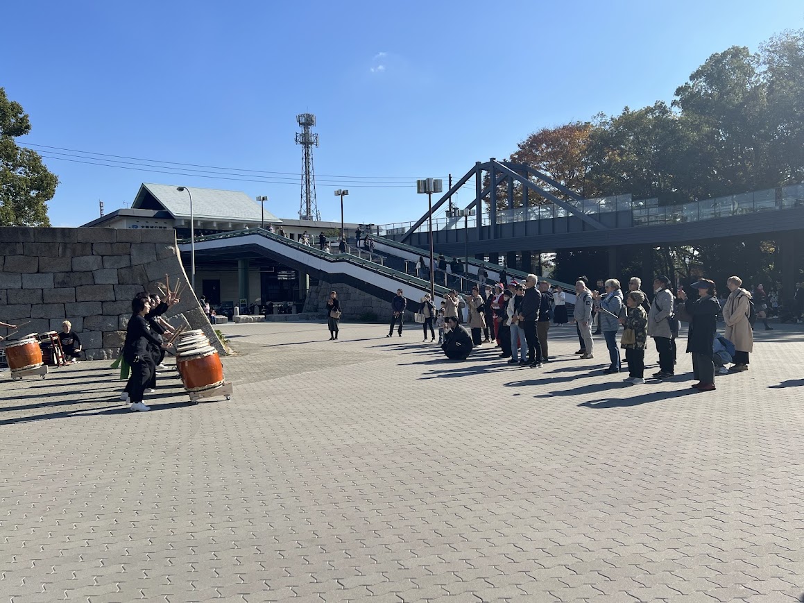 どこに行こうとか決めてなかったみたいで、ベアトリスから「どこ行きたい?」って聞かれたー。とりあえず、大阪城にでも行ってみよう。駅をでたら太鼓のでモンストレーションが始まった。ラッキー! |