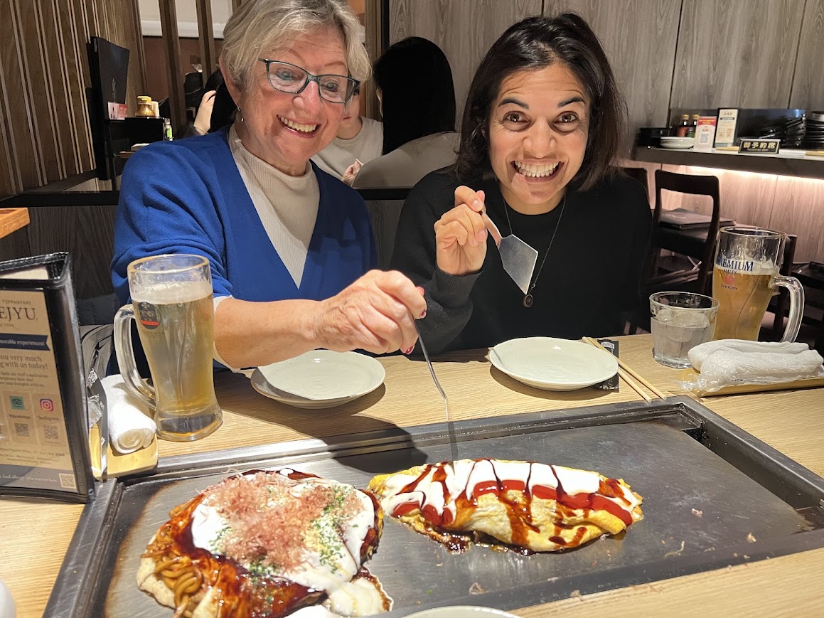 なにがいいかお友だちと相談して大阪の粉物に。 焼いている様子を動画に撮ったりしてとても楽しんでいました。 お好み焼きも焼きそばもモダン焼きもペロリと食べて、飲んでしゃべって楽しい時間でしたー |