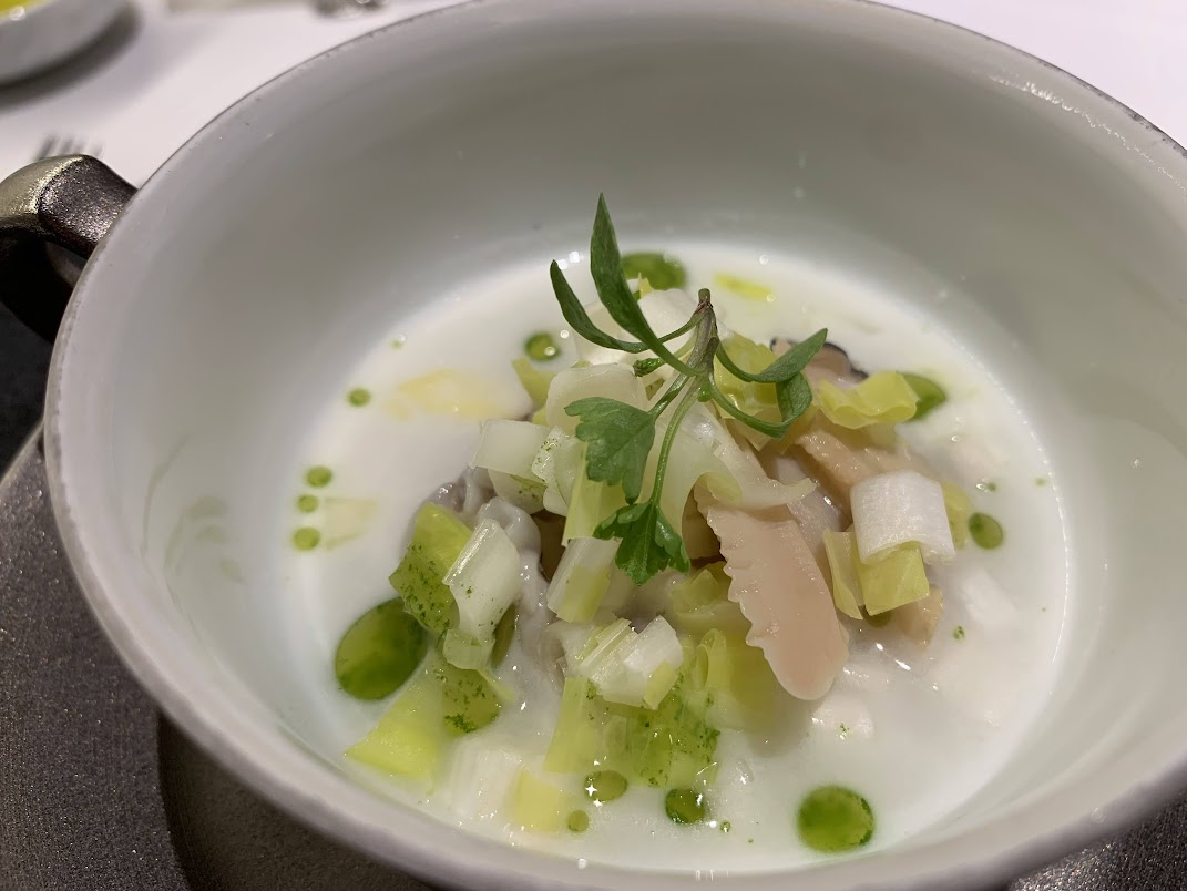 定番のレストラン「セッタンタ」。いつも大好きな食材をおいしく料理してくれます。季節のハマグリをつかったクラムチャウダー。でっかいはまぐりが贅沢です。 |