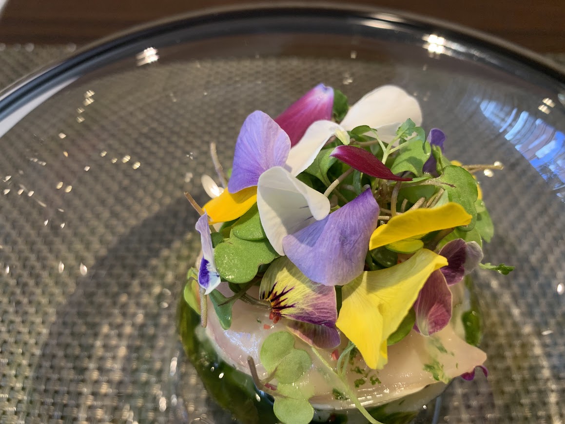 三つのアミューズのあとは前菜。カンパチを塩昆布と一緒にマリネしてフェンネルときゅうりのサラダを添えて。アサリのエマルジョンソースでいただきます。季節を感じる美しい一品。 |