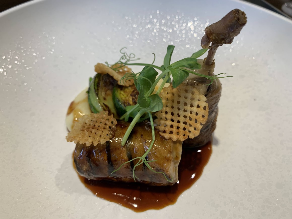 前菜二つのあとにお魚料理がでて、お肉料理。お肉料理はスペイン産のうずら。 |