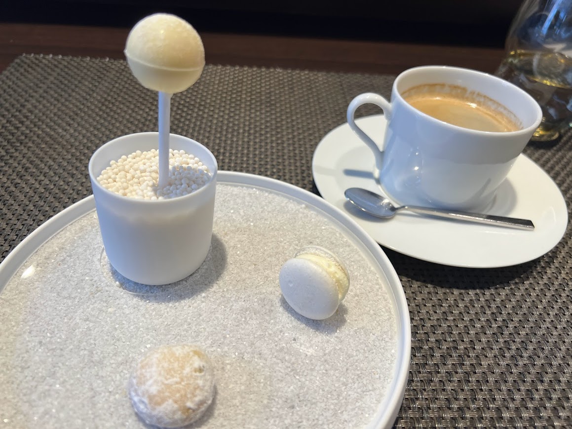 コーヒーと小菓子。 アミューズもカリフラワーで真っ白でした。デザートも白!小菓子も白! |