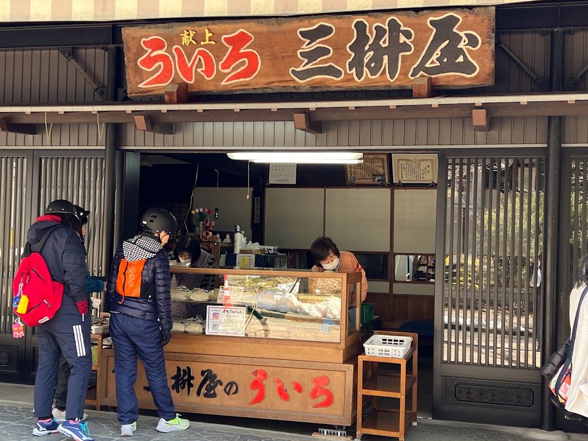 参道で気になるお店を発見。 「三升屋」さん。明治40年創業の老舗で、上皇が皇太子時代に献上されたのだそう。名物のういろうをいただきます。 |