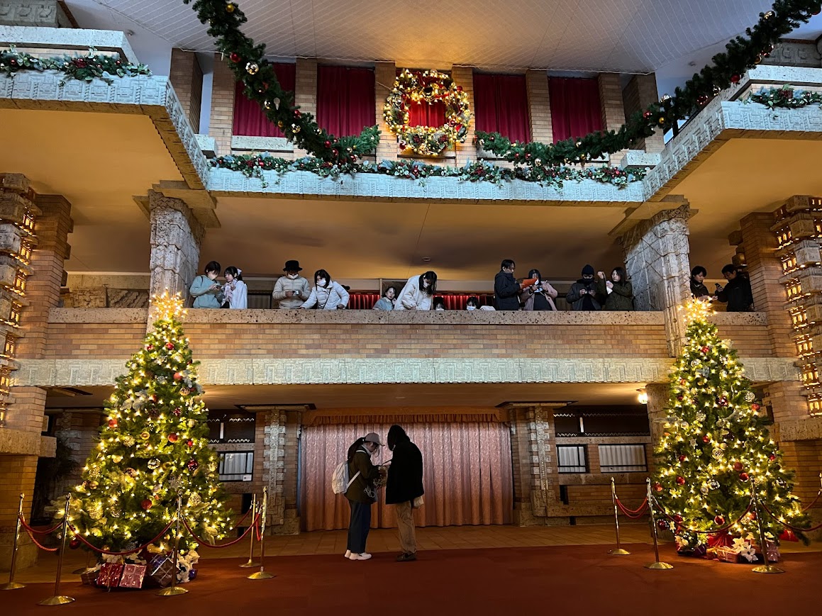 帝国ホテル玄関 クリスマスツリーが素敵なんだけど、みんなツリーを観たり、建物を楽しんだりしていなくて何かに夢中。明治村は「謎解き」が有名で、みんなそれを一生懸命解いてます。以前一度チャレンジしたことがあります。その頃は参加費が500円ぐらいだったんだけど、今は2000円以上するのでやることはないです... |