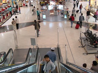 ドバイへ到着。飛行機から見たドバイは砂漠の都市。行きは夜中ですから道路や海岸線の街灯がオレンジ色に並び、とても整備された都市であることを印象付けます。帰りは昼間ですので、そこが砂漠の都市であることがわかります。道路もタイヤの踏むところ意外は砂といった感じです。関空からの飛行機を降りてCONNECTIONという表示へ進むと、24時間営業の免税店街です。いままで行ったことのあるどの空港よりも綺麗で大規模な空港でした。