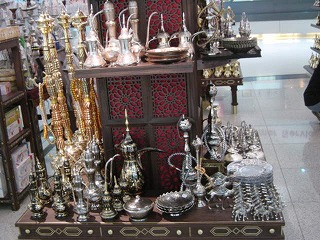 免税店は、酒やタバコ、CDといったおきまり品はもちろんですが、こんなドバイらしい品もあります。有名なブランドショップはあまりありませんでした。物価は安く、売店のコーラが30円ぐらい。ビールは60円ぐらいでした。ちなみに関空の売店の缶ビール(350CC)は世界で一番高い450円です。(そんなことだから飛行機が降りてくれないのだ!→関空!)空港のスタッフは、さすがにアラブ。白いアラビアンな衣装でした。なんかとってもうれしくなりました。