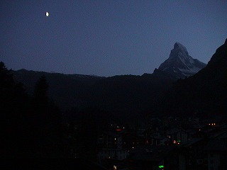 ホテルの部屋にあるバルコニーからはマッターホルンが月明かりに照らされていました。やっとここまでたどりつきました。感動です。 (明日へ→)