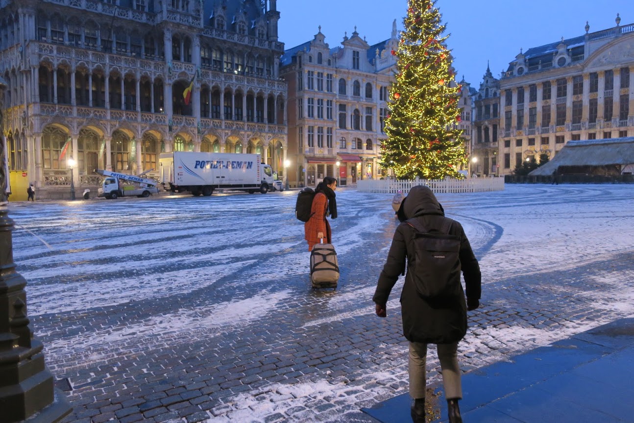 グランプラスはまさかの白銀! 石畳と雪って超すべる!これ、マジやばいです。 それでなくてもスーツケースは石畳が苦手。さらに足元つるつるですよ。 |