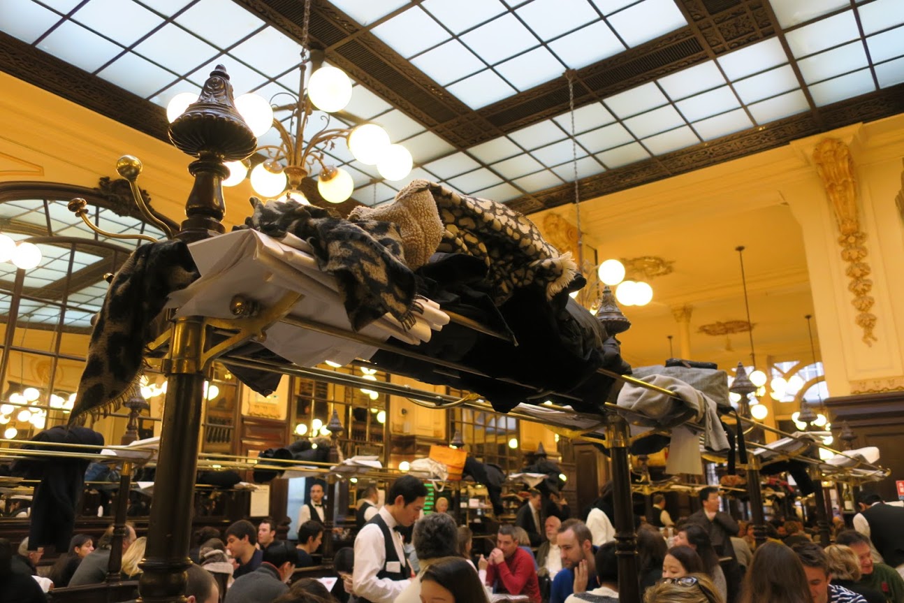 店内にぎっしりとテーブルがあって、脱いだコート等は置くところがありません。 というか、電車の網棚のような網棚がありました。 |