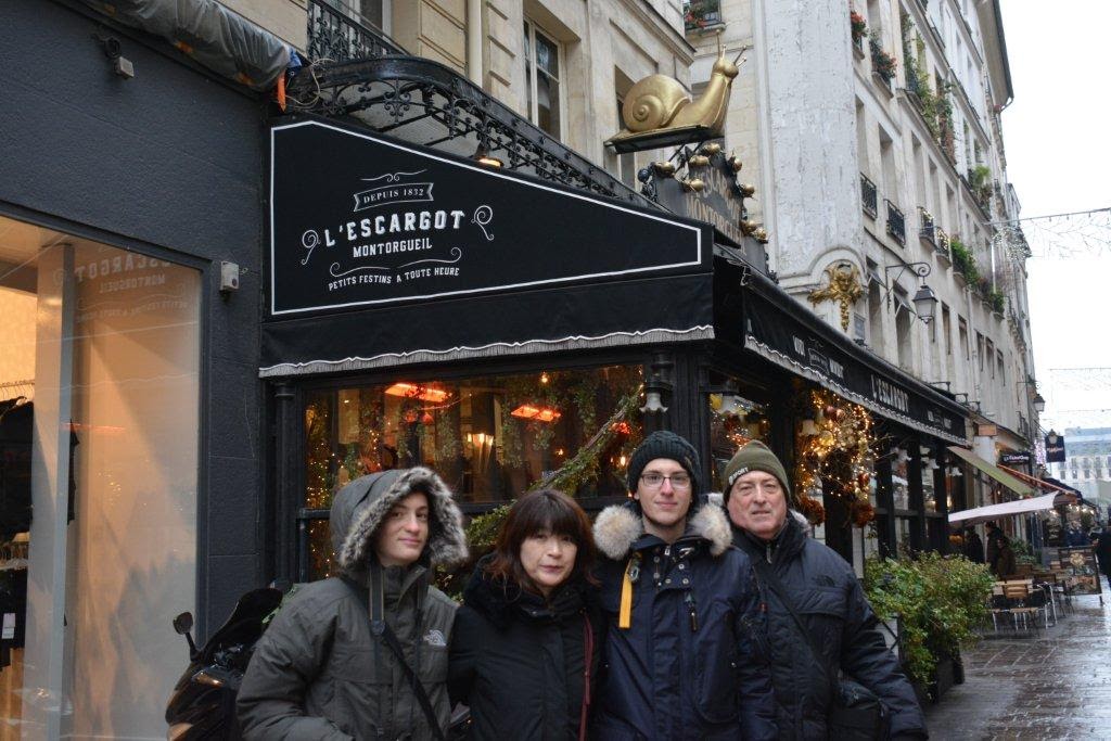 30分ぐらいかけて注文をきめました。 フィリップが頼んだ前菜のエスカルゴを試食させてくれました。 食べ方の指導中。こんなピックと専用のエスカルゴバサミで、さざえのようにくりぬきます。超うまい! 身を食べた後の貝殻に残ったおつゆがたまらない。 |