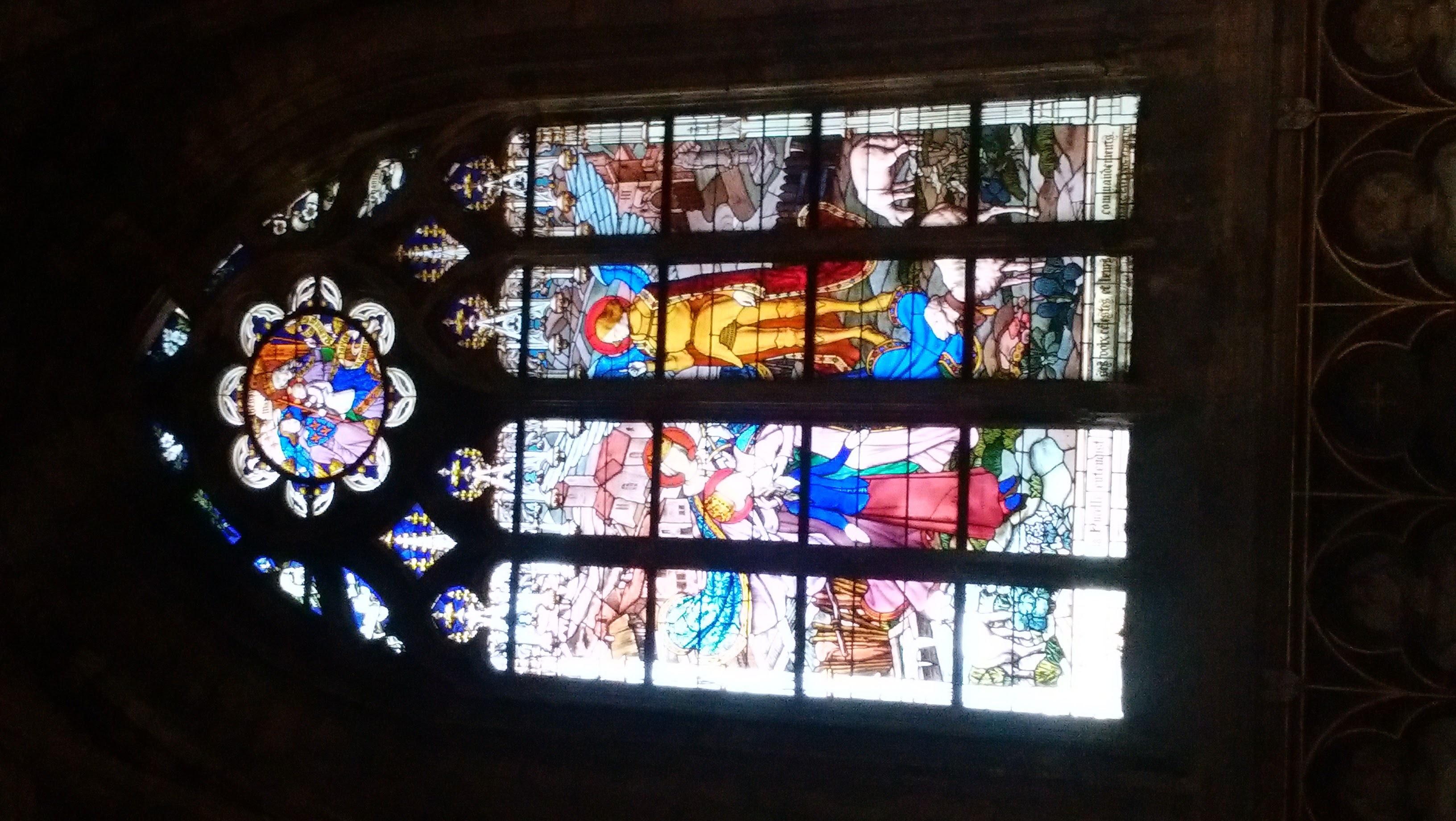 大聖堂の中には全面にステンドグラスがあるのですが、そこに描かれているのはジャンヌ・ダルクの一生です。 フランスの田舎町で生まれ、13歳で神の声を聞き、16歳で剣を取り、19歳で火刑台というストーリーだそうです。 大聖堂にキリストのストーリーではなくってジャンヌ・ダルクのストーリーってあたりもすごいです。まさに神ってますね、ジャンヌ・ダルク。 |