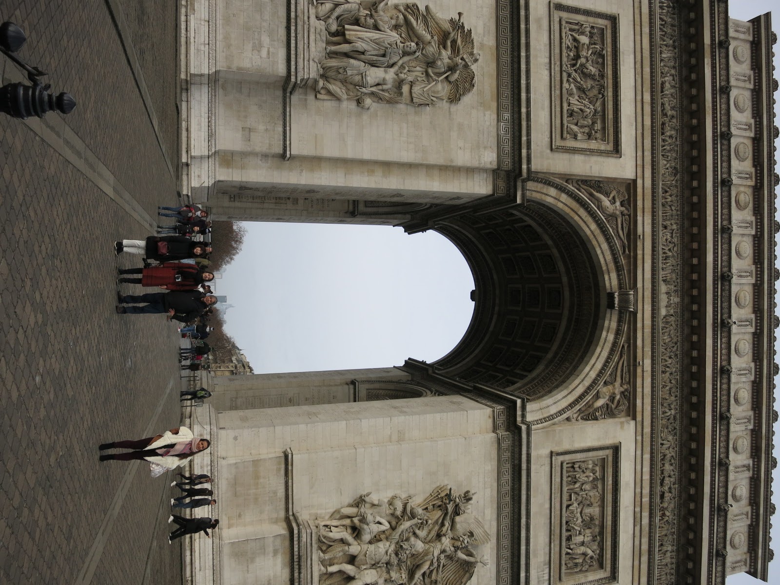 後ろにエッフェル塔。 この凱旋門がら放射状に道が延びているのでパリの中心感満載です。 まだ朝早くて空いていましたが、それでも中国人多い! |