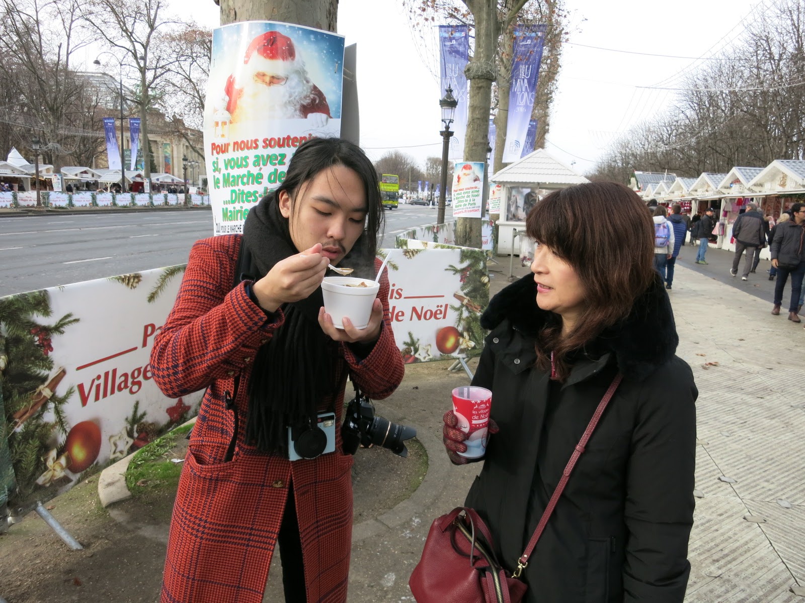凱旋門からコンコルド広場へ向けてシャンゼリゼをお散歩です。 途中、大規模なクリスマスマーケットをやっています。 名物のホットワインと玉ねぎスープ。 スープ絶品。大量のクルトンとチーズを入れてくれます。 これはうまい! |