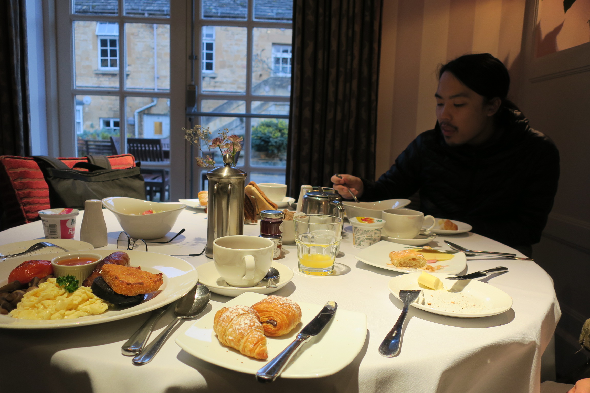 13日目はコッツウォルズのアンティークなホテルで目覚めました。 で、朝食。窓からの景色がすばらしい。映画の中にいるみたい。 こんな世界が現実にあるねんなぁ。 |