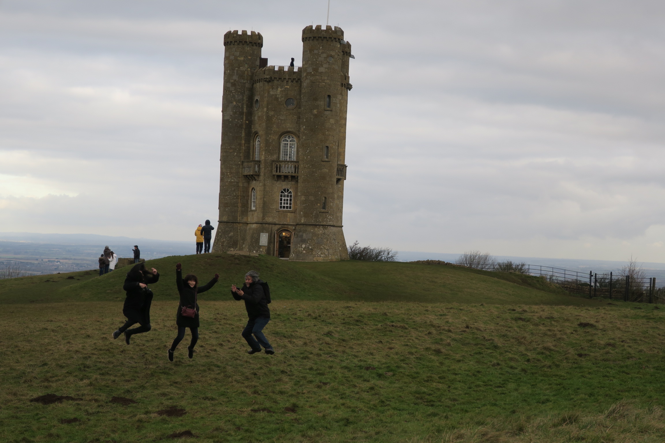 そんな牧場地帯の丘の上にブロードウェイタワーという金持ちが道楽で作った?タワーがあります。コッツウォルズを一望できます。 ここで恒例の家族ジャンプ! |