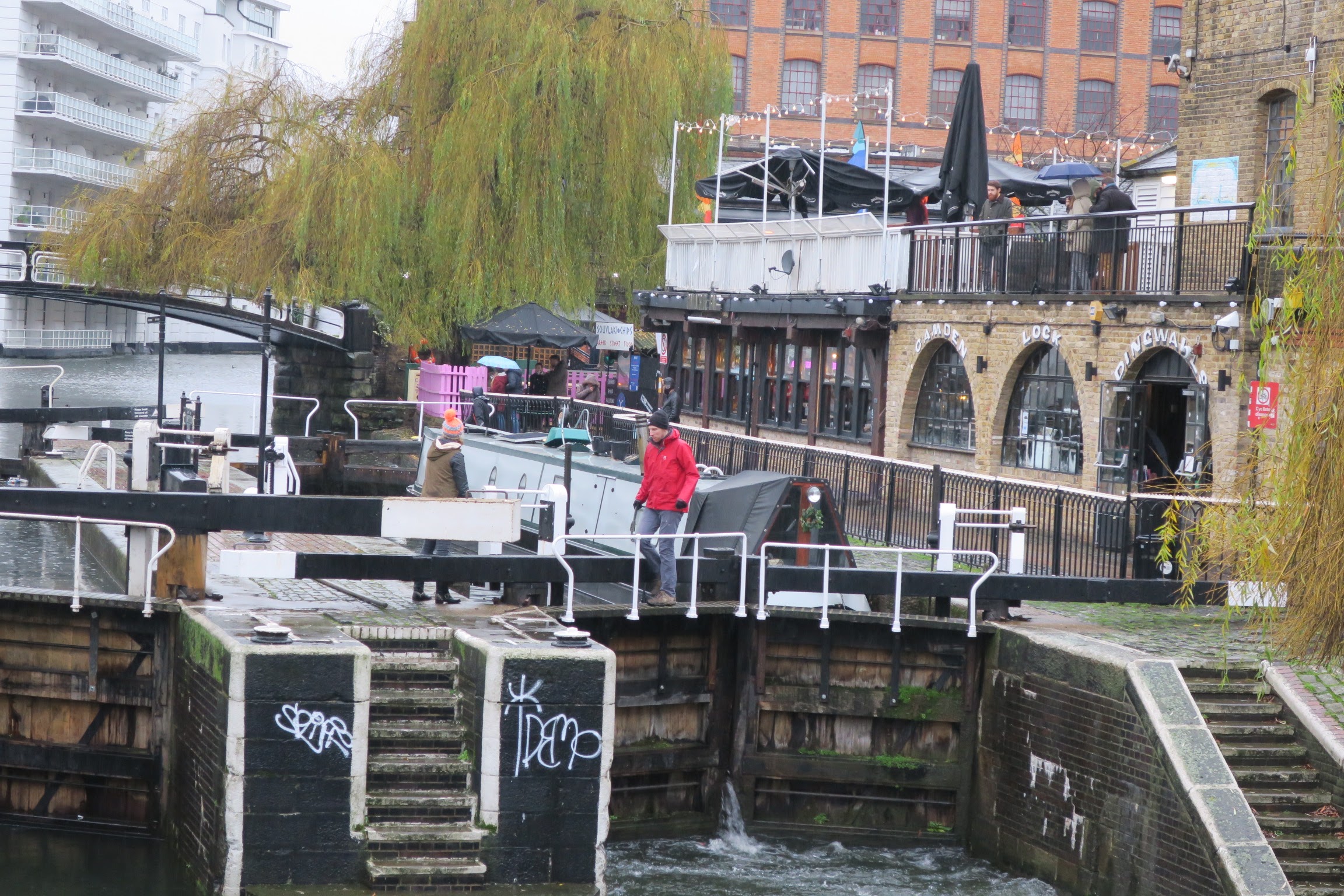 カムデンタウンは工業地帯の跡地を再開発的なところです。 レンガ造りの工場を小売店にした的なお店が多数。 また、ロック(閘門)もあります。運河の高低差を通過する 水門です。ちょうど船が通過するところでした。 |